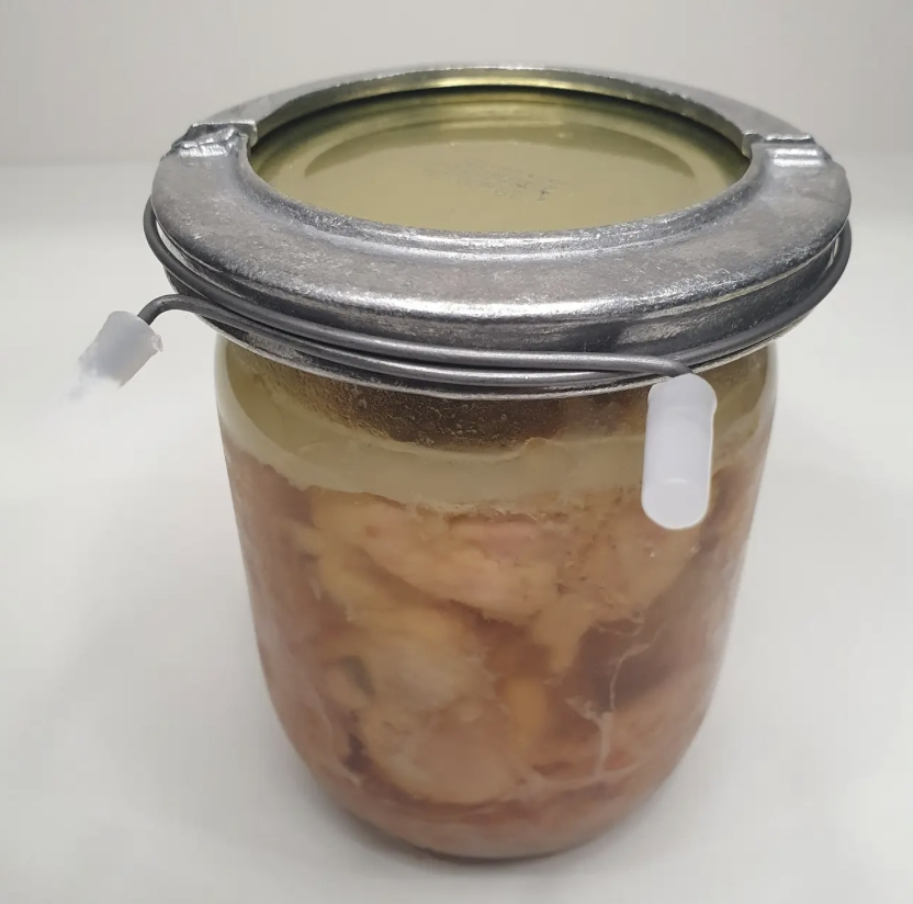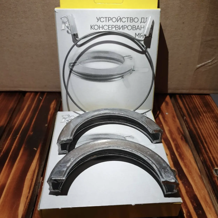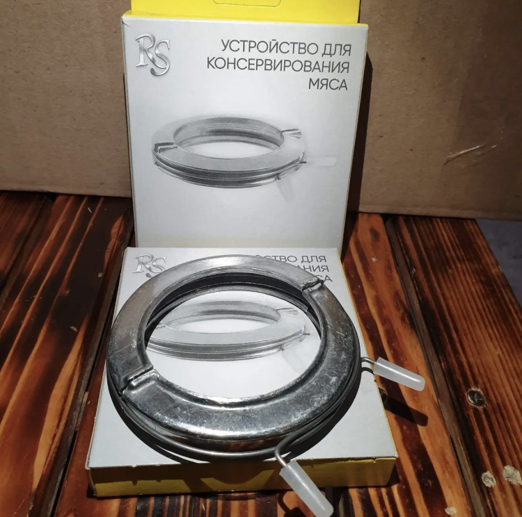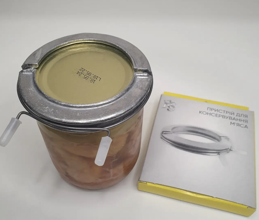 На загорнену кришкою скляну банку з шматочками сирого м'яса надіти два півкільця таким чином, щоб вони щільно охопили горловину банки і кришки, стягнути їх пружиною, після чого банку можна ставити на термічну обробку